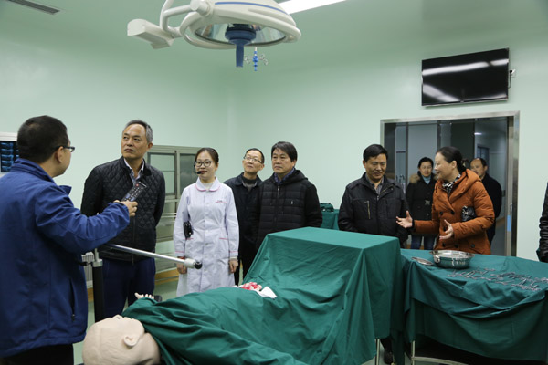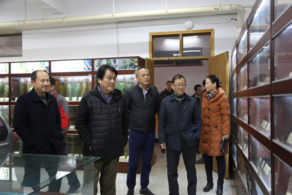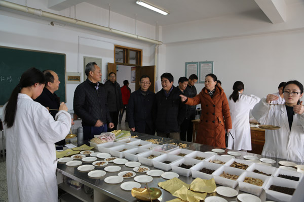 吴应年组长一行先后参观了学校体育场馆,驻足观看了“中国医药发展历史铭文步道”、“伟哉·医药”大型浮雕等校园医药文化景观,考察了中药标本室、生命科学馆和固体制剂、化学制药、液体制剂、模拟ICU病房、手术室等实训基地的建设情况。
