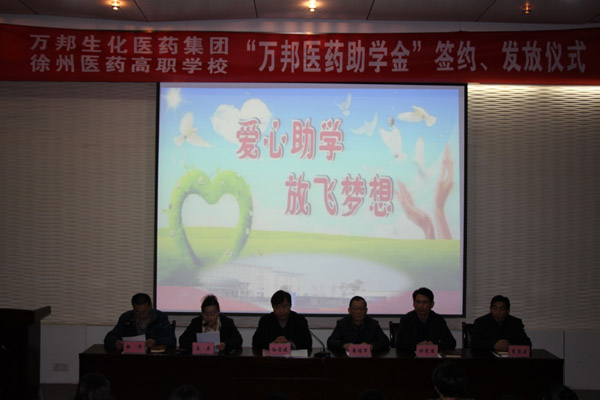 11月29日,我校在多功能报告厅(阶梯三)举行了“万邦医药助学金”签约、发放仪式,江苏万邦生化医药集团有限责任公司工会主席、副总裁孙宏建先生,工会副主席、人力资源部培训经理马乐女士,我校崔福军校长、佟光进副校长、学生工作处李道启副处长参加了签约、发放仪式,仪式由学生工作处张华处长主持。