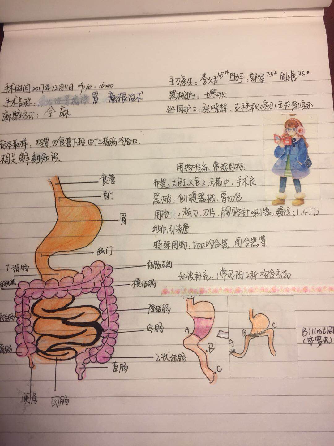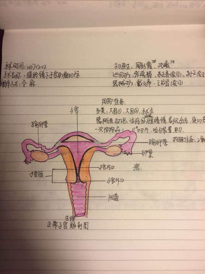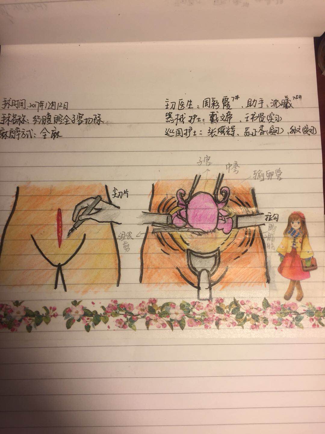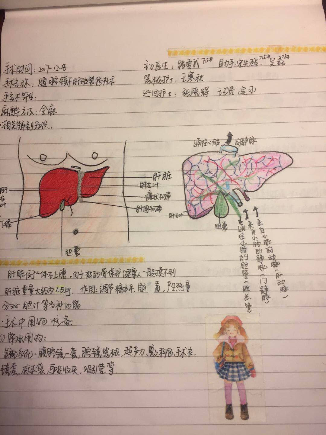 前不久,王书贤同学进入手术室实习,对她来说是一个难得的学习机会,可以亲眼见到活体器官,由于她有手绘解剖图的习惯,就习惯性地将每台手术的解剖图都详细的绘制在学习笔记上,帮助自己学习记忆。为了使自己手绘手术解剖图能够准确,王书贤同学将绘制的解剖图带到手术室,让带教老师帮助修改不足,带教老师不但认真给予指导和更正,还激励她说“这种主动学习的意识非常好,具备了成为一名好护士的潜质”。