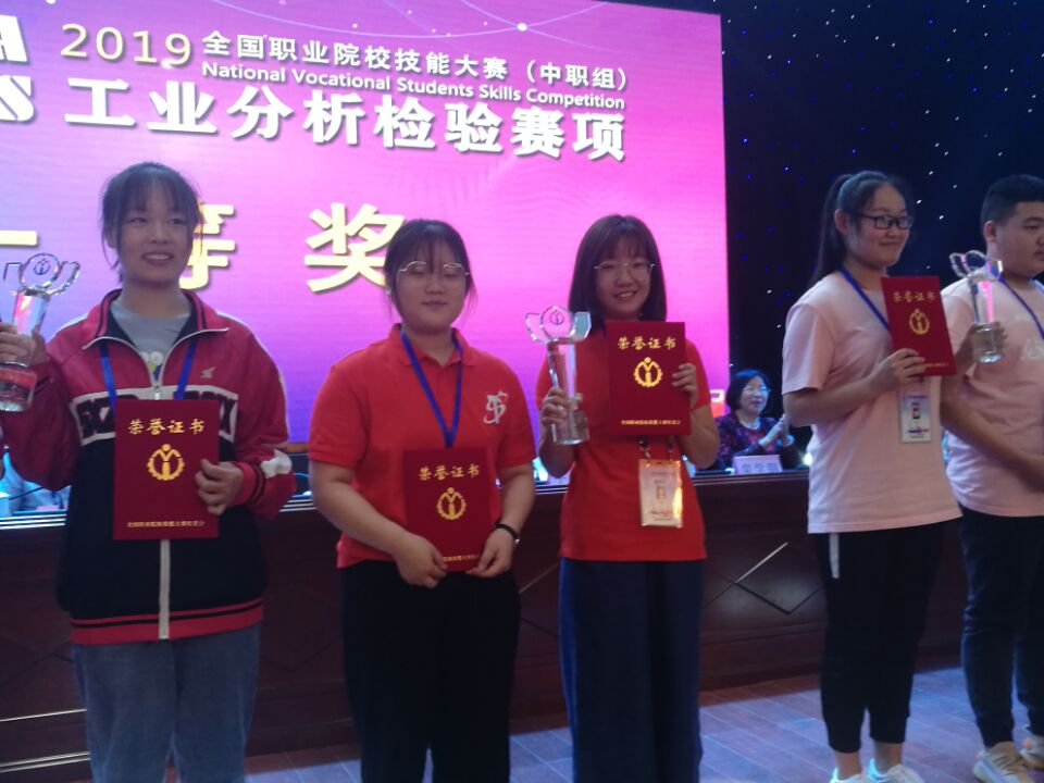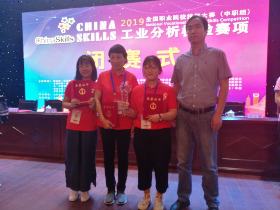 5月29日至6月2日,由教育部、天津市人民政府、国家发展和改革委员会等36个国家部委、行业协会联合主办的2019年全国职业院校技能大赛(中职组)工业分析检验赛项在寿光市职业教育中心学校举行。本次大赛共有33个省、市(计划单列市)、自治区、新疆生产建设兵团的56支参赛队112名选手同台竞技,参赛队伍、参赛人数为历年之最。我校高俊婕、薛晨宏两位同学组成参赛队代表江苏省参赛,经过激烈的比拼,最终以团体总分第二名的优异成绩荣获一等奖,指导教师王玉婷副教授获得优秀指导教师称号。