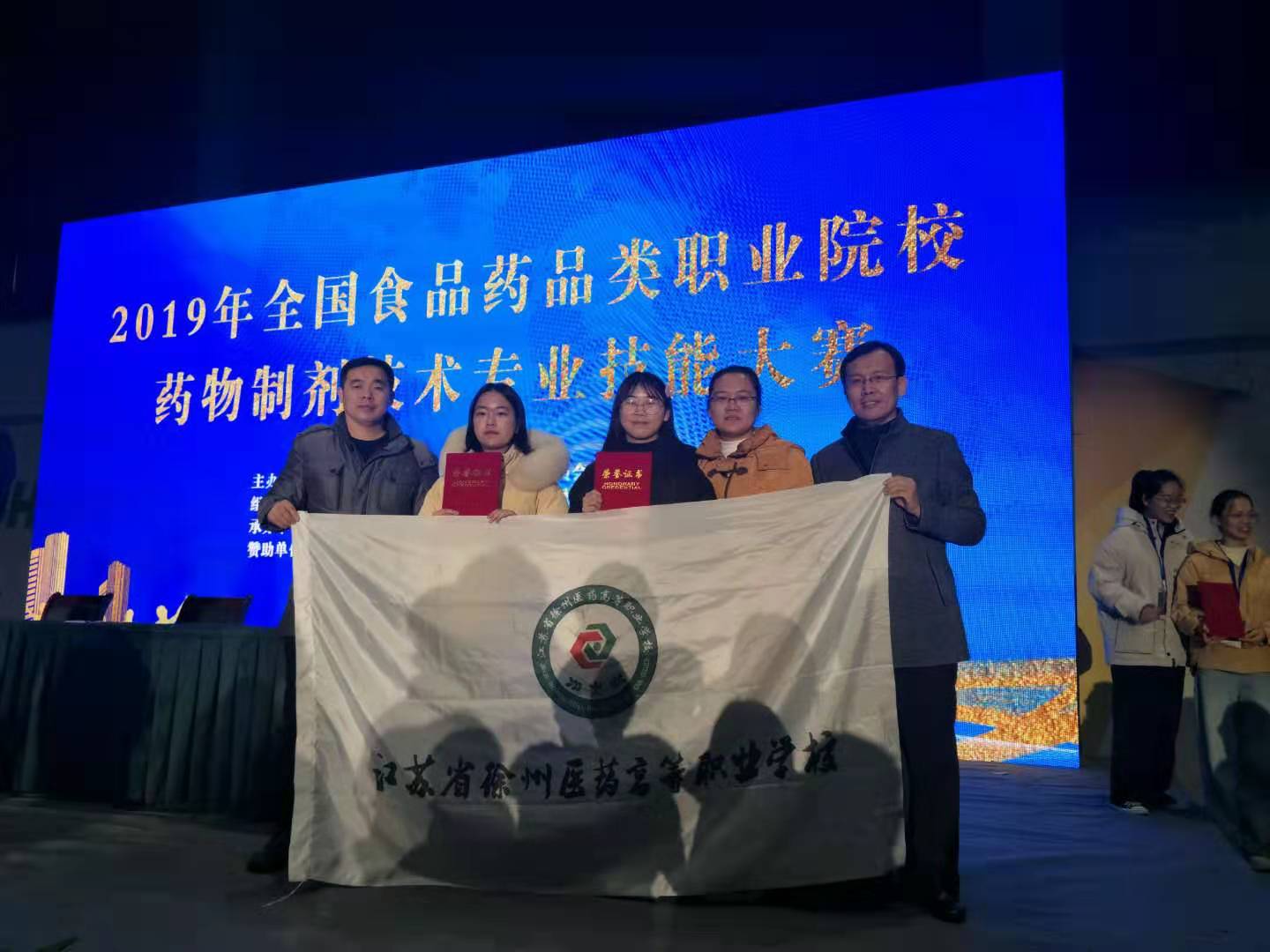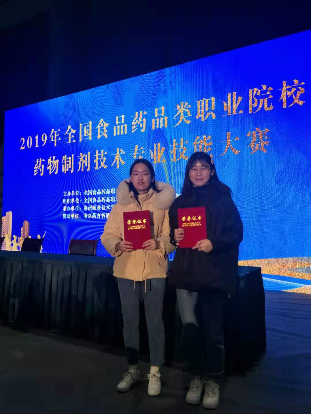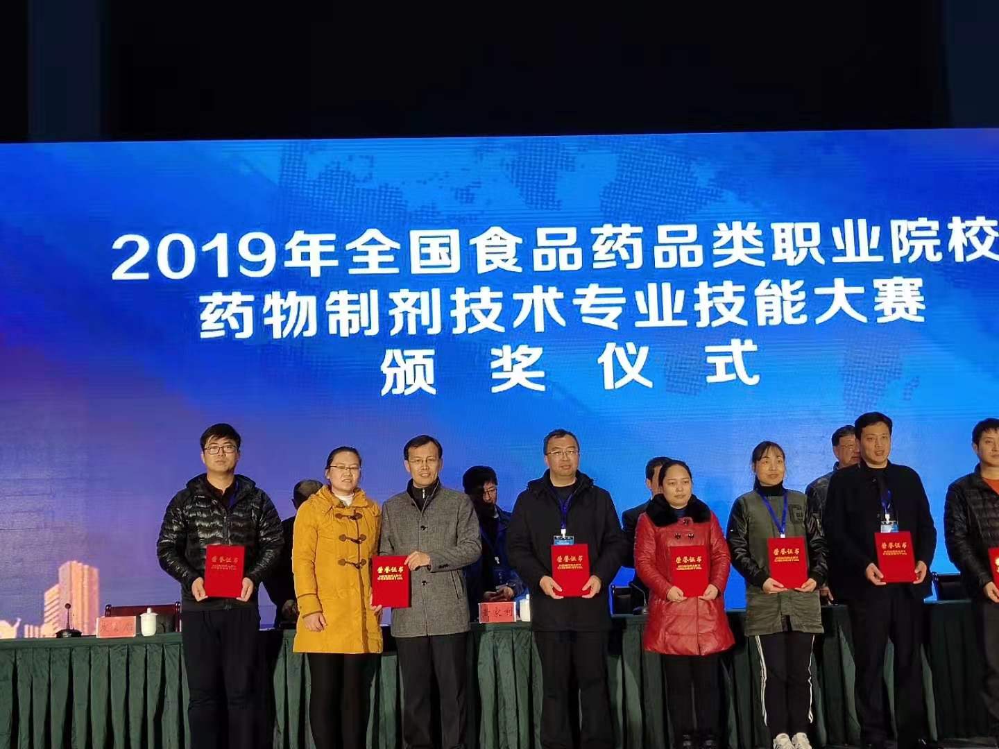 2019年12月20日至22日,2019年全国食品药品类职业院校药物制剂技术技能大赛在泰州职业技术学院举行,我校选手周诗怡、余莲组队代表学校参赛,在61支代表队中脱颖而出,荣获一等奖,这也是我校在这个项目上蝉联金牌。牛森和付宝慧两位指导老师被评为优秀指导教师。