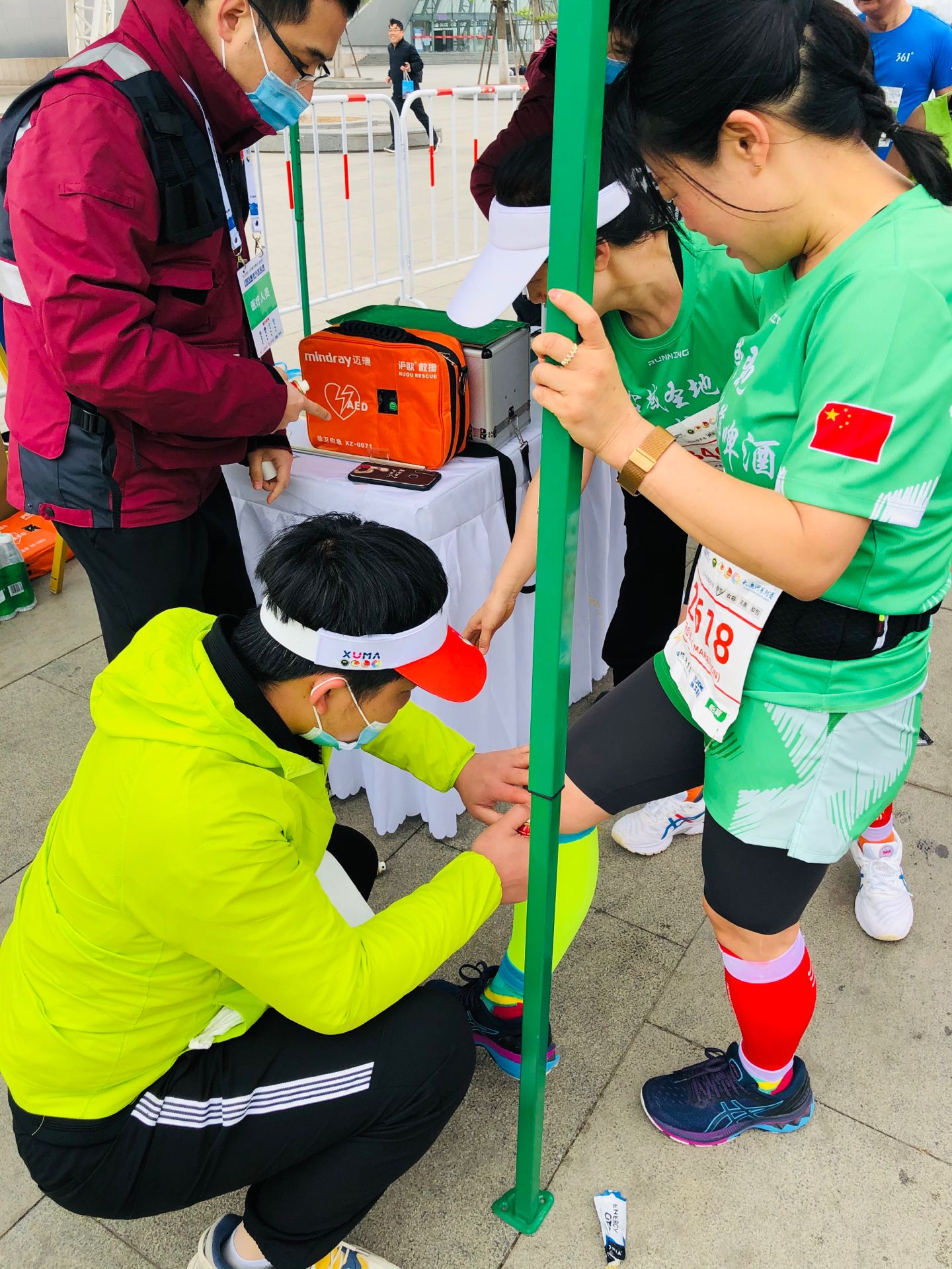 为保证在赛道封锁前到达赛场指定位置,朝阳尚未出现,在漆黑的夜色之中,150名医疗志愿者全员集结,在老师的带领下赶赴赛事现场。晨光熹微,志愿者们一边紧锣密鼓地做着最后的检查,一边在略带寒意的晨风中静待盛会的到来。比赛开始后,150名医疗志愿者在专业医生的指导下,实时观察运动员的身体状况,发现问题及时处理,用自身的专业知识和实际行动为大赛奉献力量。