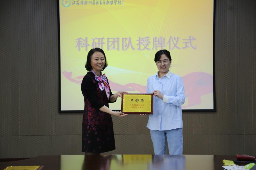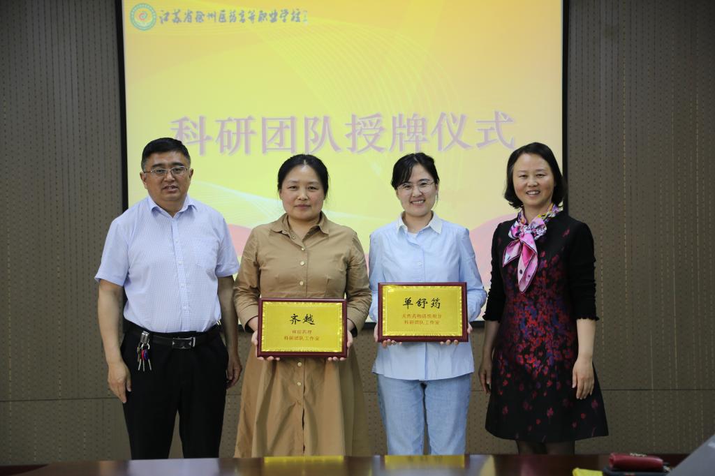 为落实人才强校战略,充分发挥学校高层次人才的引领作用,提高教师科研水平和能力,促进专业建设,依照《江苏省徐州医药高等职业学校科研团队建设管理办法》规定的程序,经团队带头人申请,所在系部择优推荐,人事处组织评审,校长办公会审定,学校批准成立齐越“神经药理”、“天然药物活性组分”单舒筠科研团队,并于近日举行了授牌仪式。校党委书记高侠,副校长袁龙出席仪式并为团队授牌,相关部门负责人、科研团队带头人及团队成员参加了仪式。