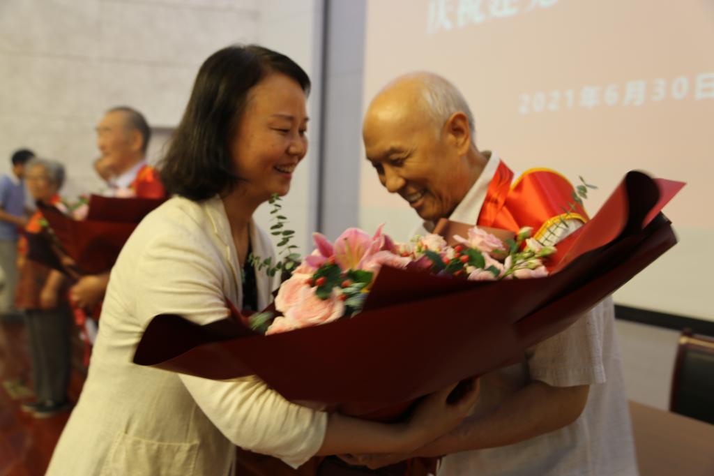 校长、党委副书记崔福军,党委书记高侠为到会的老党员代表颁发“光荣在党50年”纪念章。蔡万金同志代表老党员发言,作为学校老领导,他用自己对党的忠诚和对学校的热爱,为与会党员上了生动的一课。