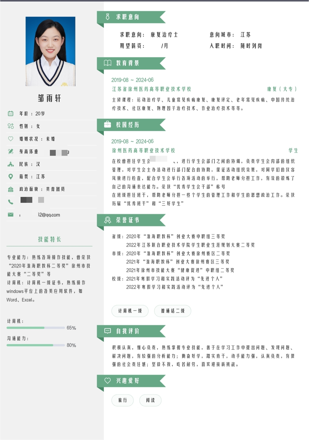 4月16日下午,护理系就业指导系列活动之“简自我风采,历职场未来”简历设计制作大赛落下帷幕。19高职康复治疗技术专业,20级高职护理、助产专业学生全员参加。本次比赛作品质量较高,大多数同学能够掌握简历撰写及设计要领,外观设计巧用心思,既整洁美观又能凸显专业及个人特点。经过评审,共有23份简历脱颖而出获得一等奖,二等奖45份,三等奖68份。