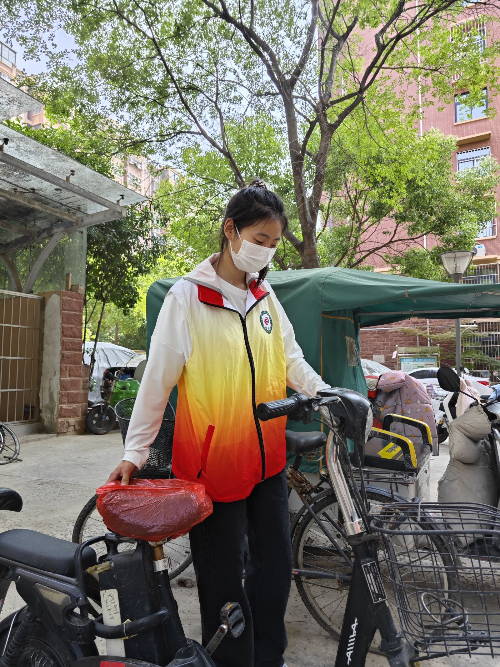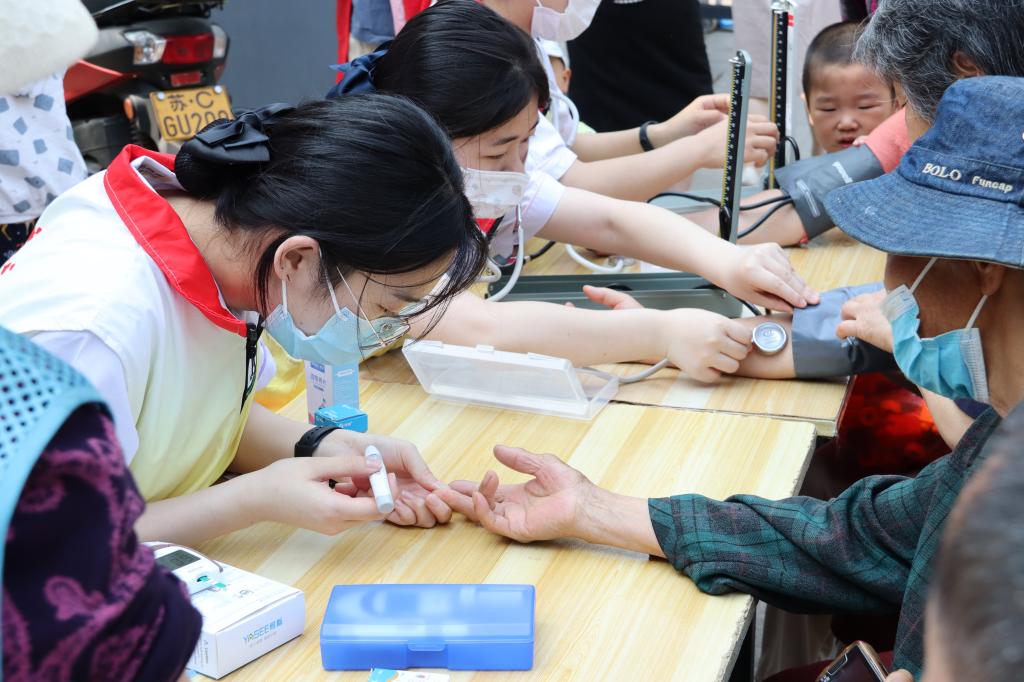 活动现场,学生志愿者们结合自身专业特点,开展了形式多样的志愿服务活动。第一小分队志愿者们为社区居民提供量血压、测血糖等健康检测服务,就居民的常见病、慢性病、急救知识进行讲解和科普,此外还对社区居民日常保健、安全用药等方面进行指导,从而提高广大人民群众安全用药意识和自身保护能力,为社区居民的健康保驾护航。第二小分队志愿者们深入绿化带内,仔细查找草皮下的垃圾,用自带的夹子将塑料袋、卫生纸、烟头等杂物清理干净,并对社区楼梯扶手、池塘护栏、公共健身器材等进行擦拭,将随意停放的电动车摆放整齐,保持社区环境的整洁。