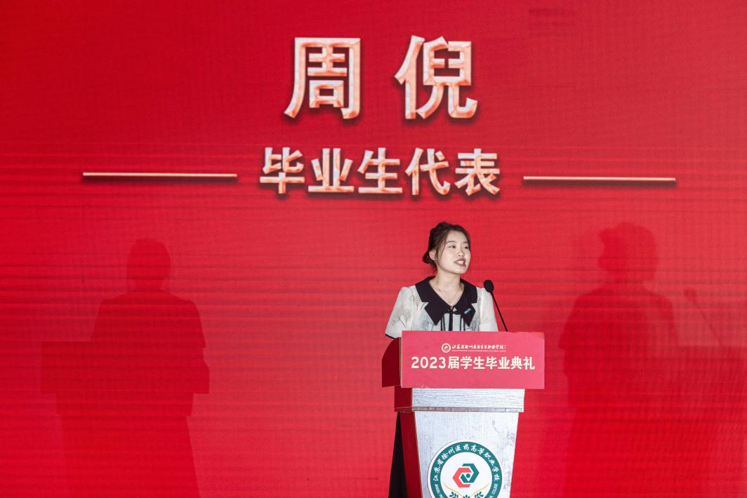 2018级高职药学1班周倪同学作为毕业生代表发表了毕业感言,她感谢学校和老师们这五年来的悉心教导和精心栽培,并代表2023届全体毕业生表示一定会牢记“厚德博学、强能济世”的校训,做一个拥有责任并勇挑重担的人,立志服务社会、报效祖国。