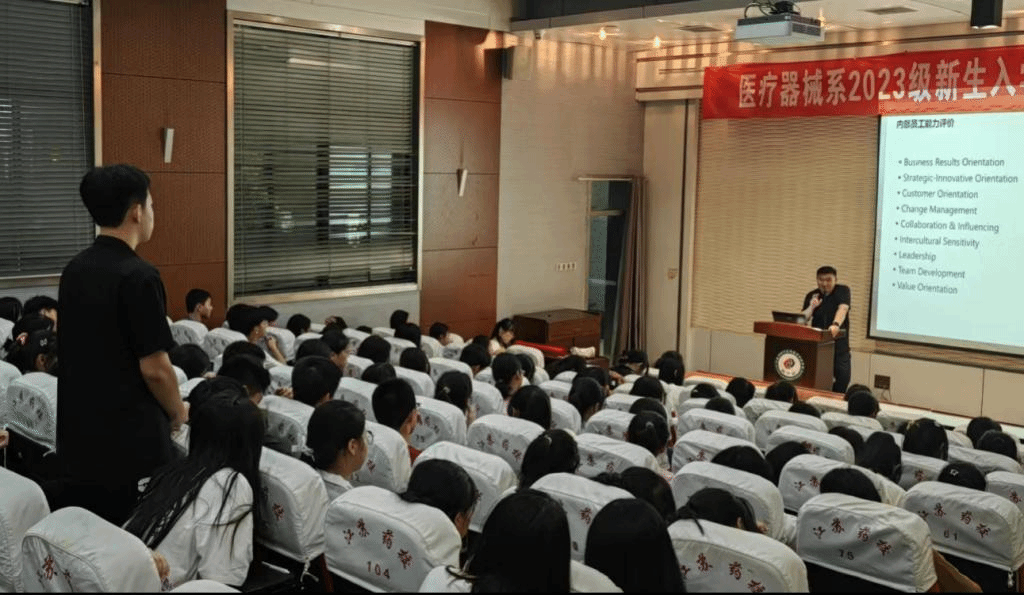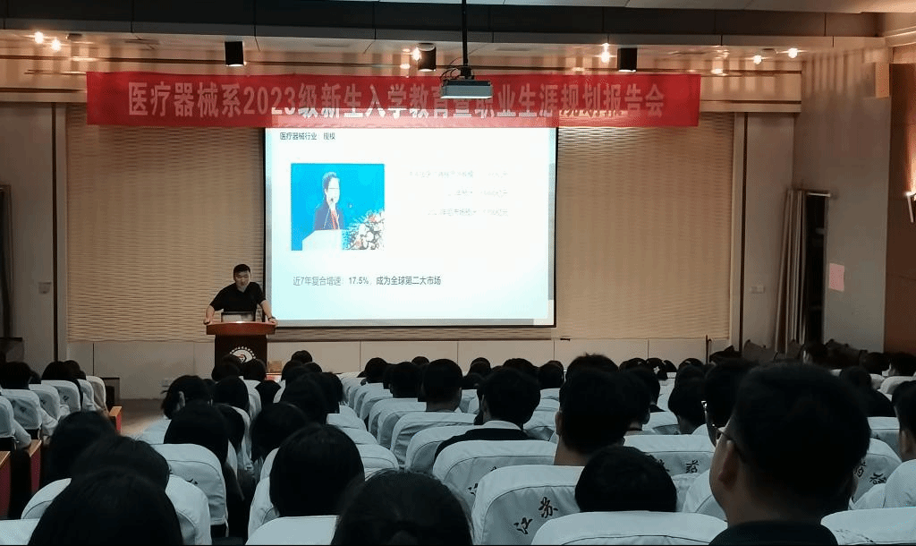 9月18日下午,医疗器械系在阶梯三教室为2023级新生开展职业生涯规划讲座。此次讲座的主讲人是来自医疗器械系校企合作企业的胡智豪总经理,胡智豪在医疗器械产业深耕多年,他用自己丰富的知识和经验,为在场的同学们带来了关于职业生涯规划的全新认识和深刻理解。