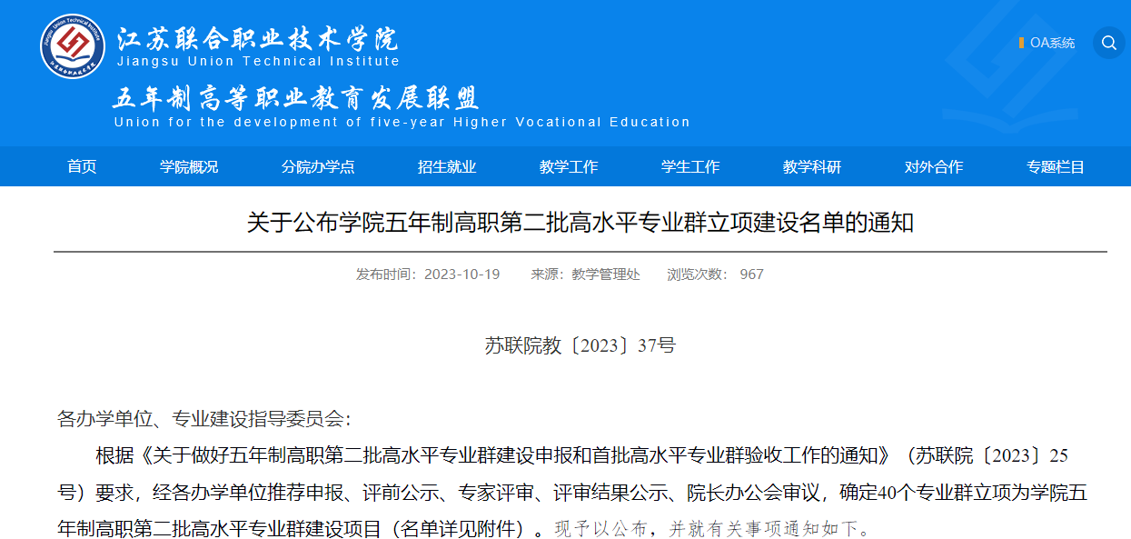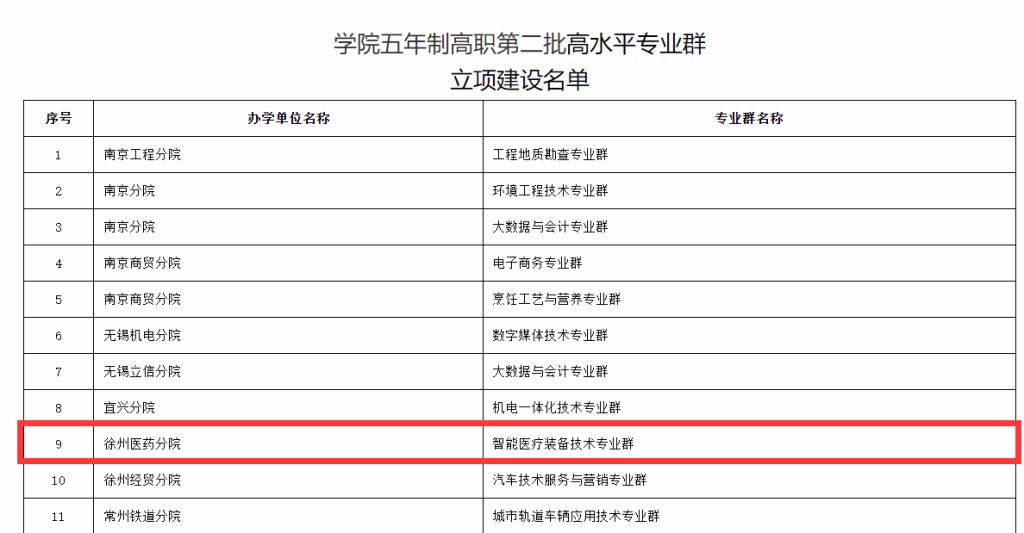 2023年10月19日江苏联合职业技术学院发布《关于公布学院五年制高职第二批高水平专业群立项建设名单的通知》(苏联院教〔2023〕37号),医疗器械系智能医疗装备技术专业群立项为学院五年制高职第二批高水平专业群建设项目。