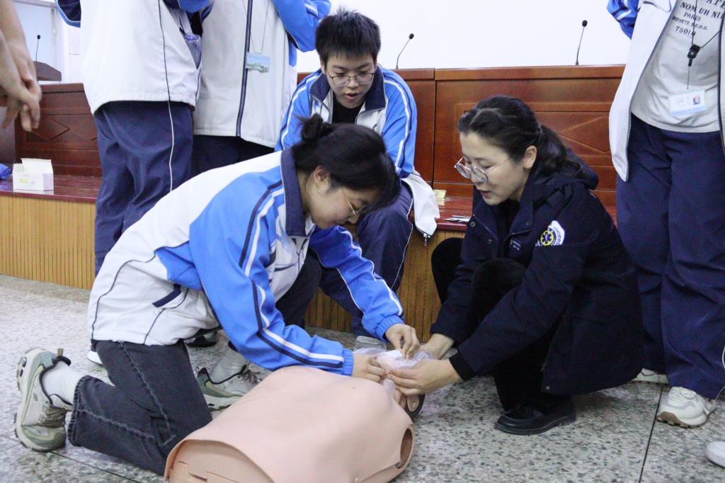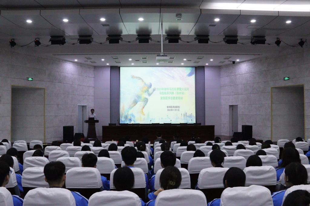 11月1日,徐州市卫健委卫生应急办公室陈巍主任、徐州市卫健委卫生应急办公室科员徐耿、徐州市急救医疗中心杨蕾蕾主任和蒋梦婷主任在护理系报告厅为全体马拉松志愿者医疗志愿者进行专项培训。培训现场,佟光进副校长对徐州马拉松工作进行了具体指示,徐州市卫健委卫生应急办公室陈巍主任重点强调了医疗志愿者现场志愿服务的注意事项,杨蕾蕾主任和蒋梦婷主任通过视频演示和现场教学,指导在场的志愿者学习心肺复苏操作步骤和AED的使用方法。