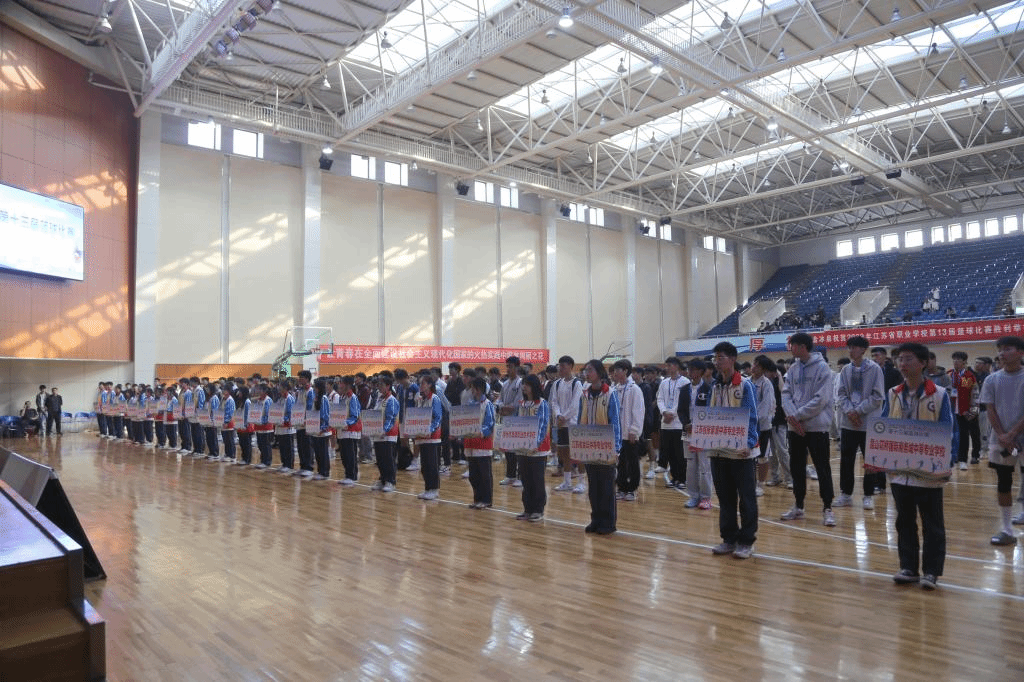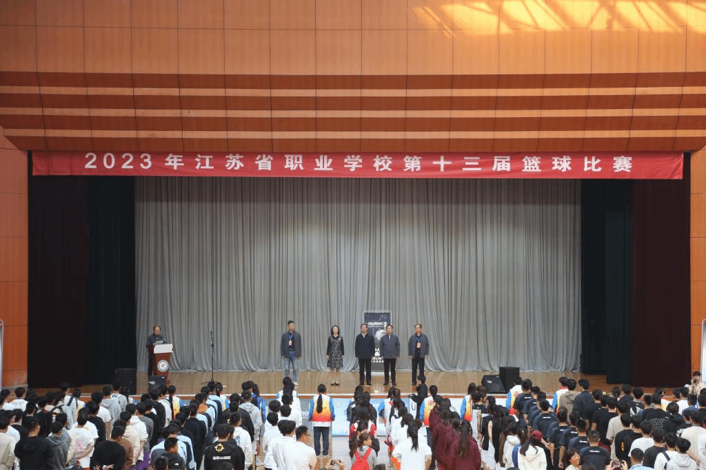 11月2日上午九点,由江苏省学生体育协会主办的江苏省职业学校第十三届篮球比赛,在我校体育馆举行开幕式。此次比赛有35所学校44支男女篮代表队参赛。这是我校承办的第三次省职业学校篮球赛。开幕式由陈志东副校长主持,省学生体协职业学校工作委员会秘书长、南京市玄武中等专业学校副校长瞿坤鸿,徐州市教育局四级调研员王学伦,学校党委书记高侠,省学生体协职业学校工作委员会副秘书长丁坚,篮球分会秘书长陈志峰出席开幕式。