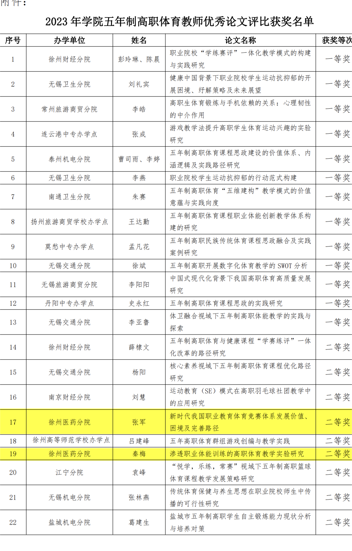 2024年1月4日,联院网站公布《关于组织学院五年制高职体育教师优秀论文评比的通知》的获奖名单,学院学指委体育指导委员会组织专家评审、公示,确定一等奖13篇、二等奖25篇、三等奖37篇。我校张军、秦梅老师的论文《新时代我国职业教育体育竞赛体系发展价值、困境及完善路径》、《渗透职业体能训练的高职体育教学实验研究》均获得二等奖。