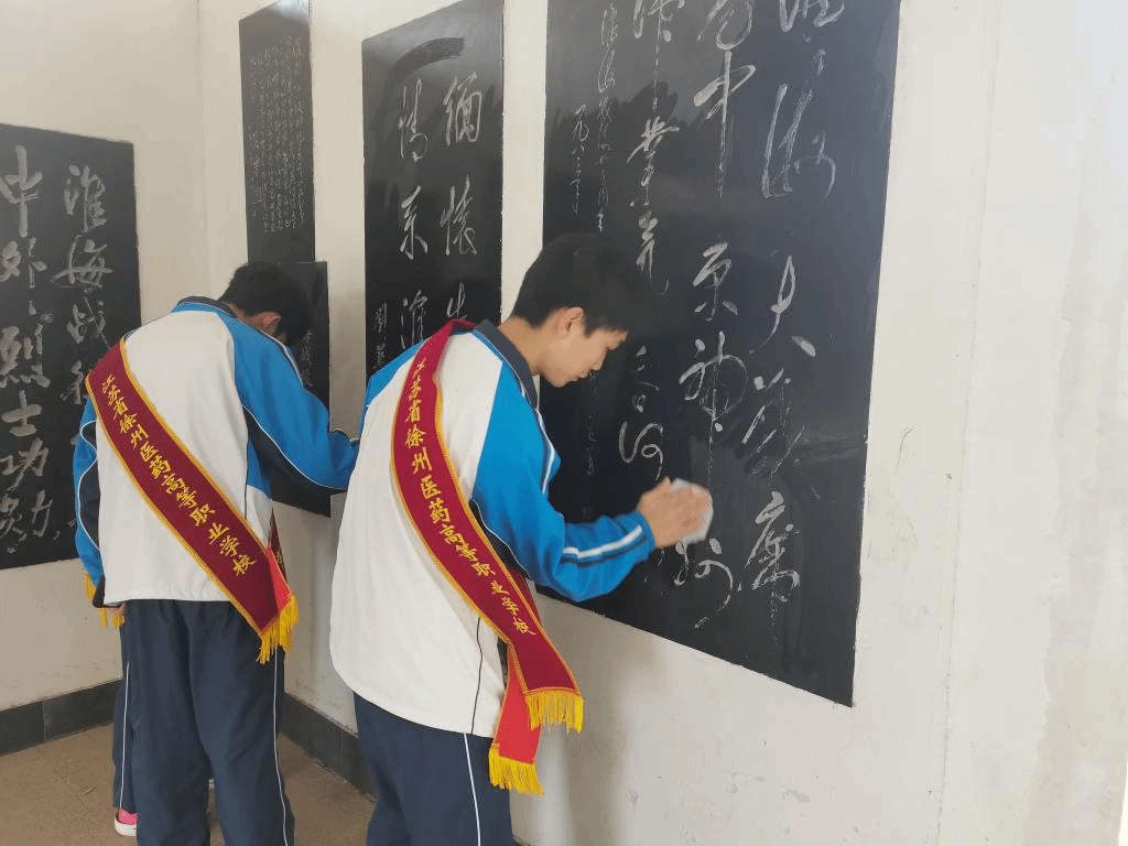 22高职药物制剂技术(2)班志愿小分队,在班主任的带领下前往淮海纪念塔下,在威严耸立的纪念塔下朗读了碑文,了解了淮海战役历史,并清洗了碑林里的全部碑刻。擦洗的过程中,志愿者们被老一辈无产阶级革命家的英勇奋斗和无私奉献精神深深地感动着。