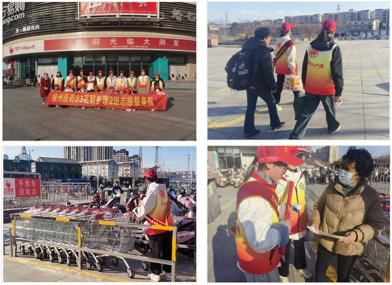 班级志愿者积极走出校门前往欣欣路大润发超市开展志愿服务活动。他们充分发挥所学专业优势为市民展开健康知识宣教;为方便顾客使用,将杂乱的超市购物推车排列整齐;看到提重物的老年人主动上前协助,并搀扶他们过马路......他们热情大方,主动服务,赢得了市民的点赞和好评。