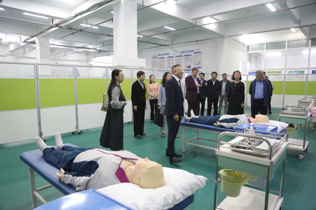 座谈会后,在校领导的陪同下,Zubair Hanslot教授一行实地参观了我校校园和护理实训基地,参观过程中,Zubair Hanslot教授饶有兴趣地亲身体验和操作了有关实训设备,并与我校师生进行了亲切友好的交流互动。