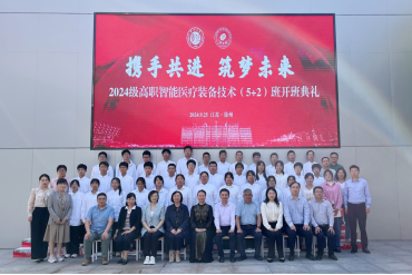 9月25日,2024级高职智能医疗装备技术(5+2)班开班典礼在我校阶梯三隆重举行。常州大学应用技术学院院长刘江珅、副院长张黎、刘靖,医学与健康工程学院副院长邹凌和生物医学工程系主任周超,我校党委书记高侠、副校长袁龙,教务处、教育督导室(发展规划处)、学生工作处相关领导出席了典礼。医疗器械系全体教师、(5+2)班学生和部分家长参加本次典礼,开班典礼由袁龙副校长主持。