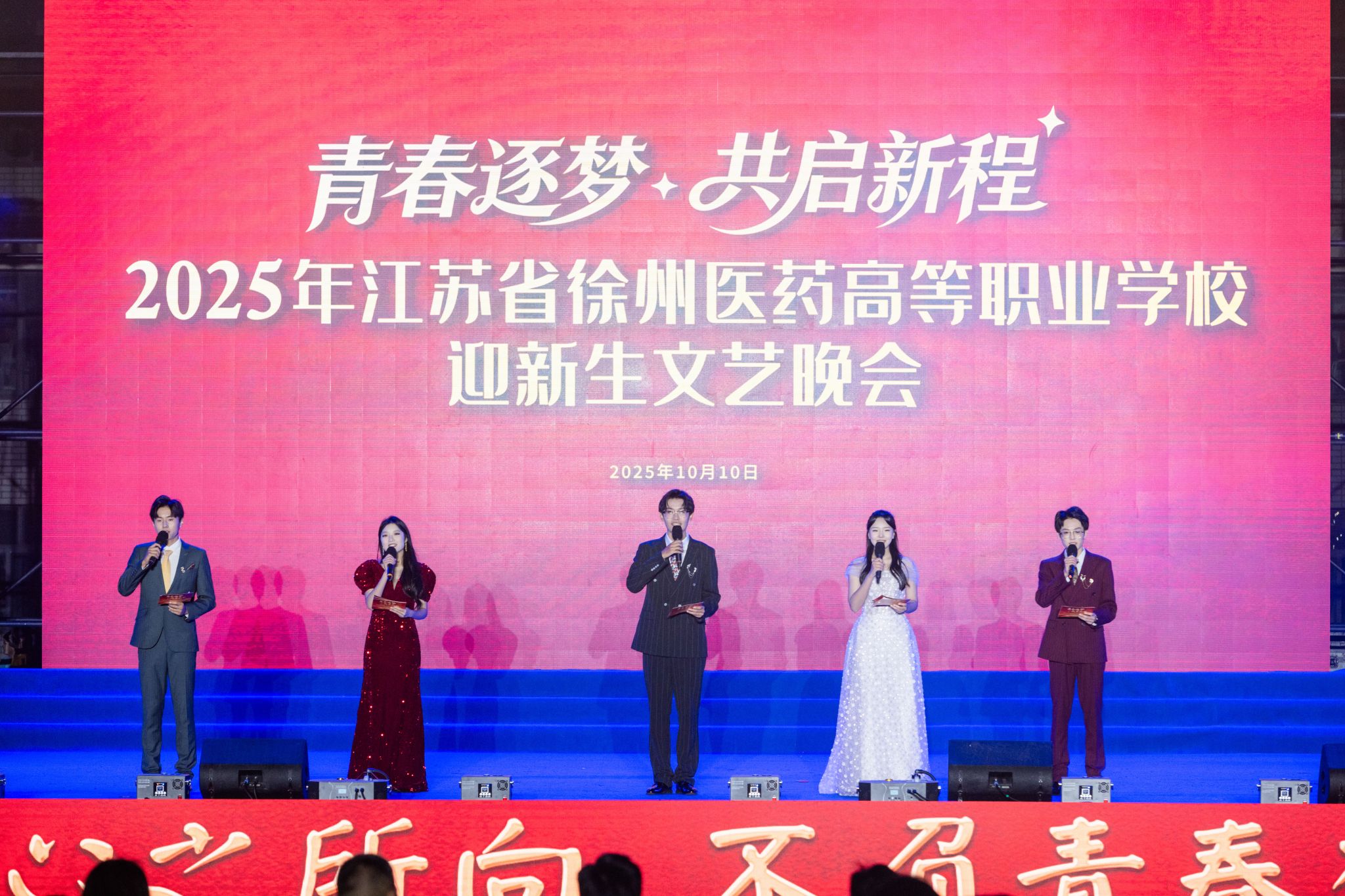 星辰共闪耀,逐梦启新程。为凝聚药校新生力量,展示校园文化成果,激励师生砥砺前行,10月10日晚,我校2025年迎新生文艺晚会在东湖校区璀璨启幕。徐州经济技术开发区科技教育局书记王志升,徐州市大庙街道党工委书记刘四宝、教育卫生科主任张宝茹,校党委书记吴明,校长高侠,副校长袁龙、陈志东、佟光进等领导嘉宾,与两千余名师生代齐聚聚东湖校区,学府校区师生则通过观看直播的方式同步参与,在歌舞交融、光影流转间,现场师生代表与线上观众共同定格了一个充满艺术氛围与青春活力的难忘之夜。