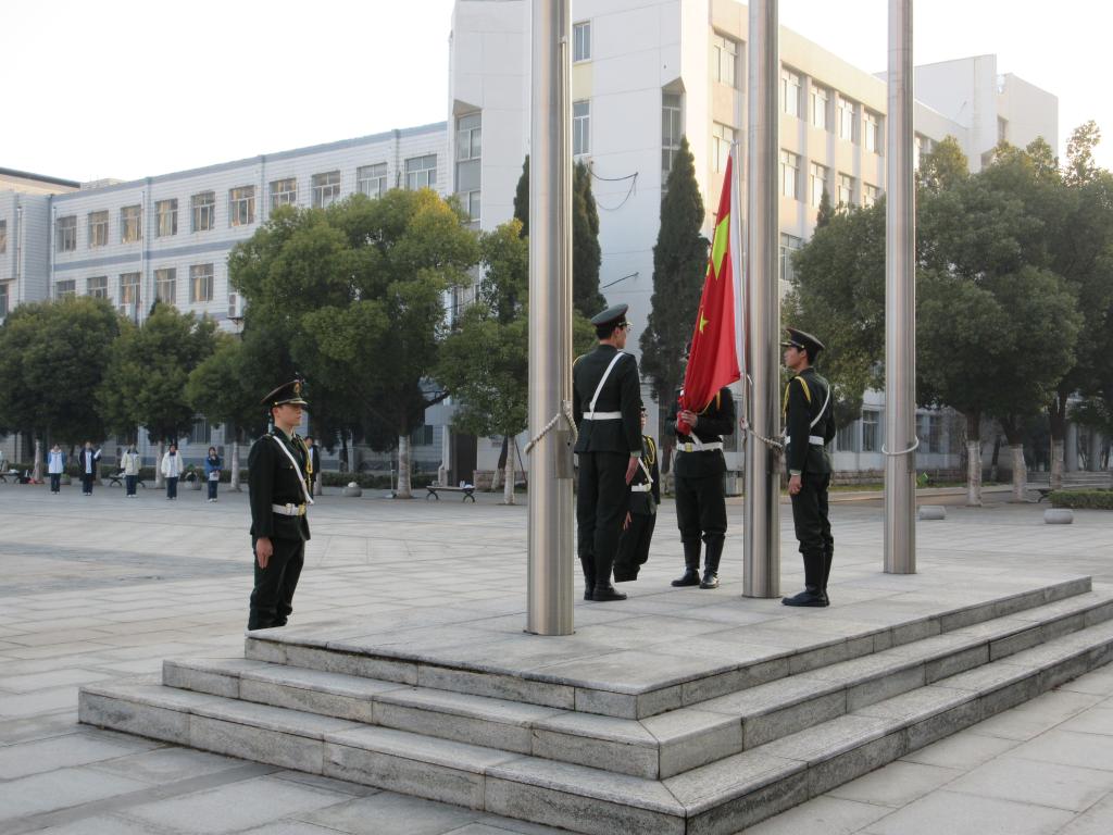 七点四十分,升旗仪式正式开始,国旗护卫队的同学步伐整齐、铿锵有力地迈向升旗台,随着《义勇军进行曲》地奏响,升旗手振臂一挥,鲜艳的五星红旗在雄壮的国歌声中冉冉升起。在初升阳光的映照下,全体师生激昂地齐唱国歌,面向国旗行注目礼。