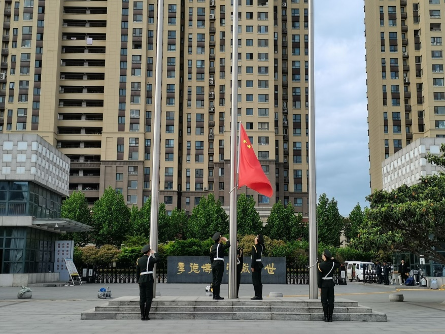 升旗仪式上,五星红旗在朝阳的映照下缓缓升起,全体师生肃立,面向国旗行注目礼,齐声高唱国歌