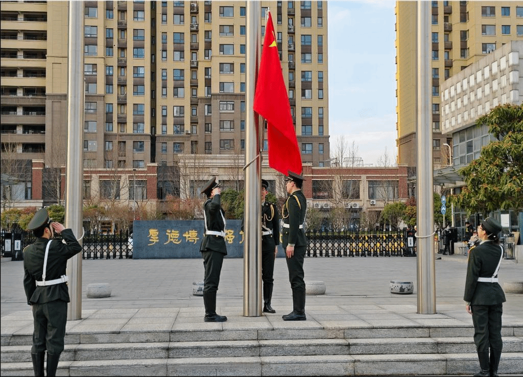早上七点三十分仪式正式开始,国旗护卫队队员身着整齐的制服,迈着铿锵有力的步伐护送国旗走向升旗台。在雄壮的国歌声中,鲜艳的五星红旗冉冉升起,全体师生列队整齐,肃立凝视,高唱国歌,嘹亮的歌声中传递着对祖国的热爱与敬意。
